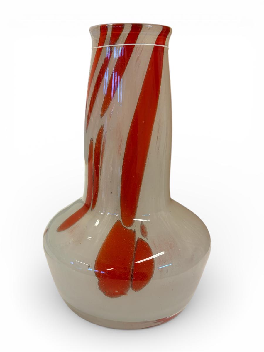 Blómavasi úr Bæheimkristal. Hvítur með rauðum flekkum. Langur háls.