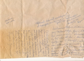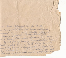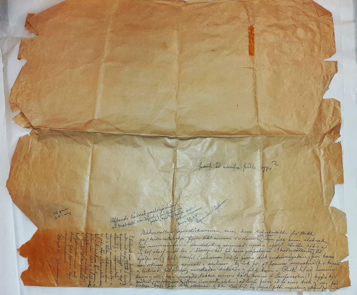 Umbúðapappír sem fylgdi uppdráttum, áteiknuðu dúkahöri og garni. Á pappírnum eru upplýsingar um tildrög og gefanda.