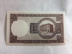 5 krónu seðill nr BO 291 781. Úr eigu Sigtryggs Klemenzsonar, seðlabankastjóra frá 1966-1971. Kom ásamt 9 öðrum peningaseðlum og 2 signötum.