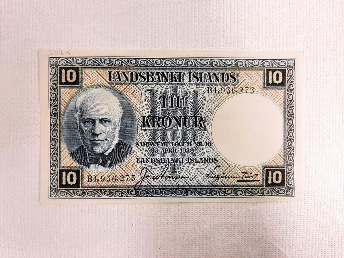 10 krónu seðill nr B1 936 273 . Úr eigu Sigtryggs Klemenzsonar, seðlabankastjóra frá 1966-1971. Kom ásamt 9 öðrum peningaseðlum og 2 signötum.