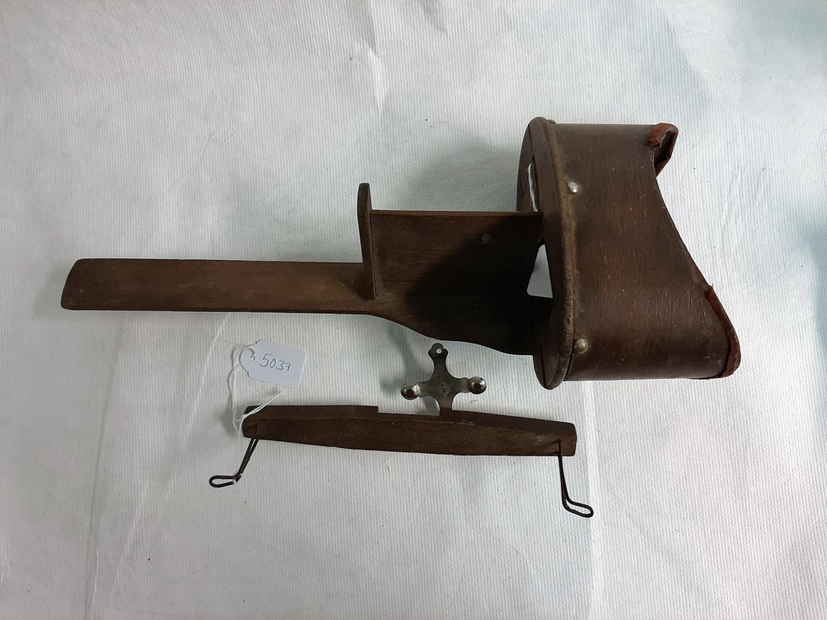 Stereóskópkíkir úr tré, statífið til að halda myndunum er laust og einnig fylgir brot sem hefur brotnað innan úr sterioskopinu. Linsur vantar.