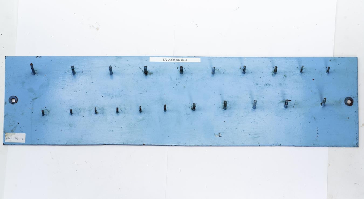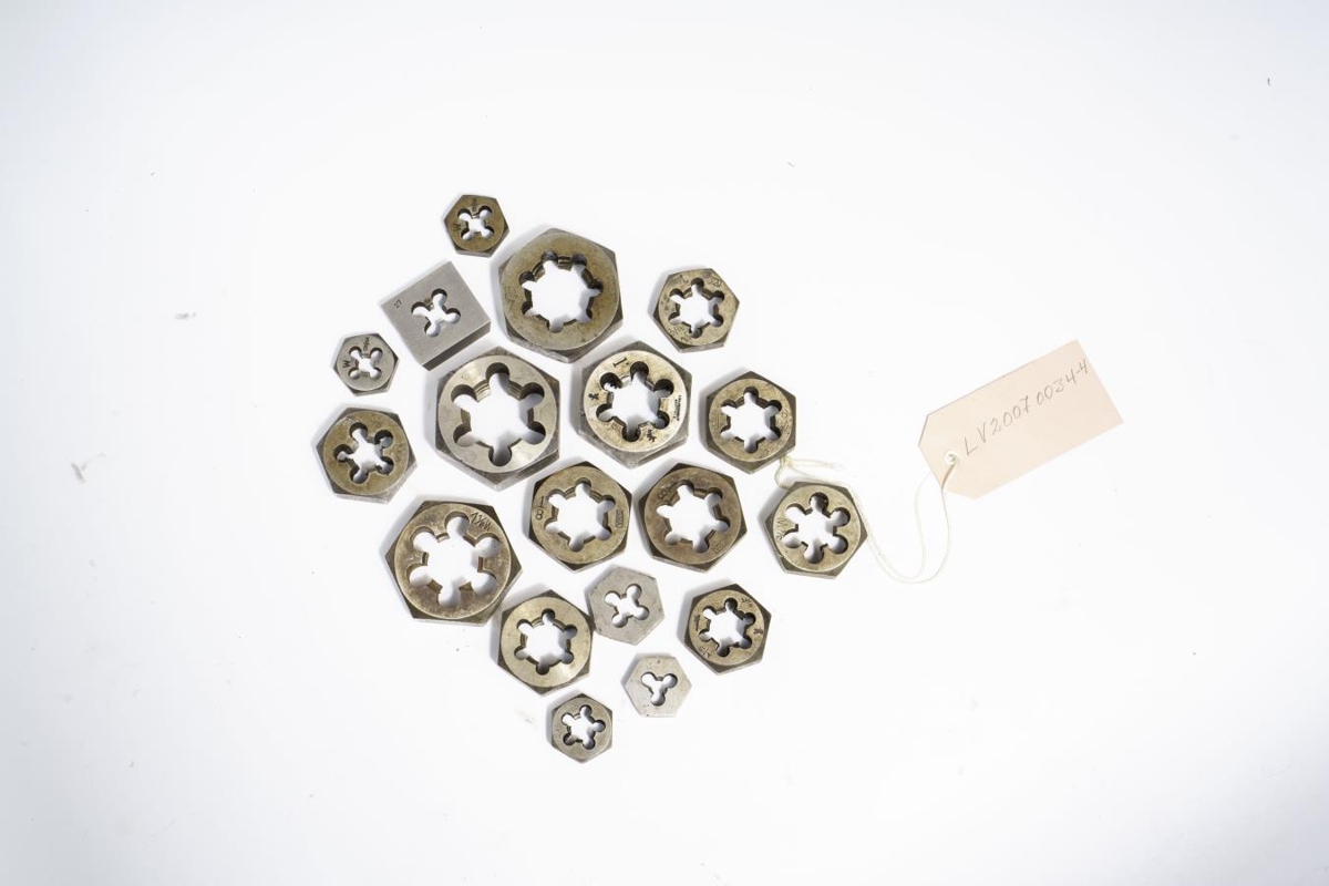 17 stk. skerrær af mismunandi gerðum og 13 stærðum/sverleikum. Skerrærnar eru með Whitworth gengjum. Þær hanga á krókum á járntöflu smíðaðri af starfsmönnum Vélamiðstöðvarinnar. Sexkantaðar. 13 mismunandi stærðir. Járntaflan er 66 cm. á hæð og 17.5 cm. á breidd.