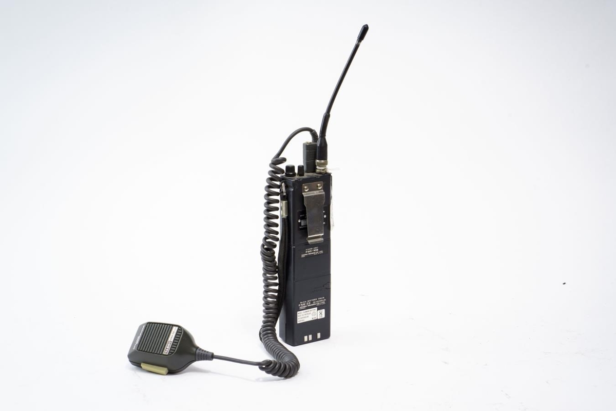 er lítill hátalari tengdur við hana. Rafhlaðan á talstöðinni er frá sama
