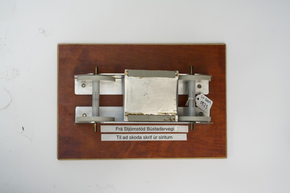 Tvö plastkefli með málmpinnum á endum. Málmpinnarnir hvíla í rifum á málmstöndum sem festir eru á viðarplötu. Ofan á, á milli keflanna, er málmplata. Strimill úr sírita er settur á annað keflið og endi hans festur á hitt keflið. Þannig er hægt að lesa af strimlinum og þræða hann jafnóðum af einu keflinu á annað. Hann rennur eftir málmplötunni.