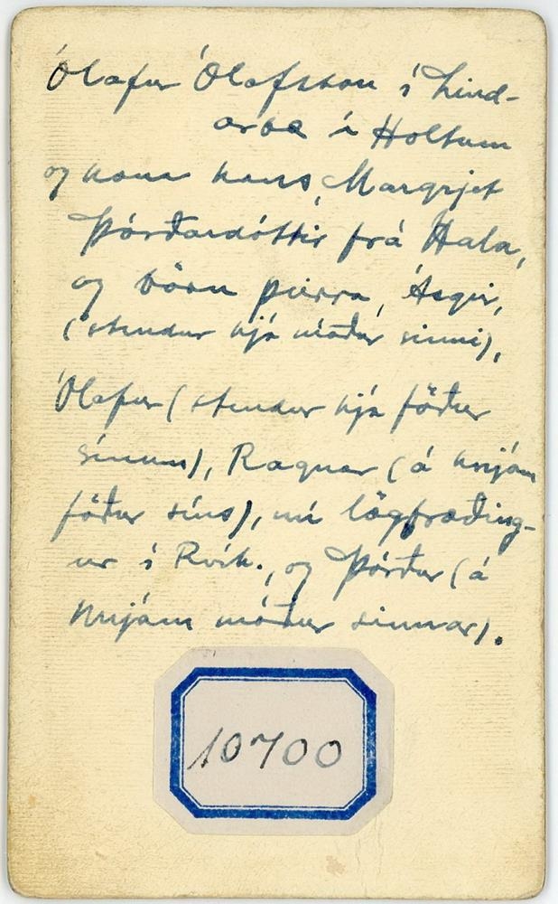 Ólafur eldri Ólafsson, 6 saman. Ólafur Ólafsson, bóndi á Lindarbæ í Holtum, og kona hans Margrét Þórðardóttir frá Hala, og synir þeirra, Ásgeir (stendur hjá móður sinni), Ólafur (stendur hjá föður sínum), Ragnar, lögfræðingur í Rvík, (á hnjám móður sinnar) og Þórður (á hnjám föður síns).
