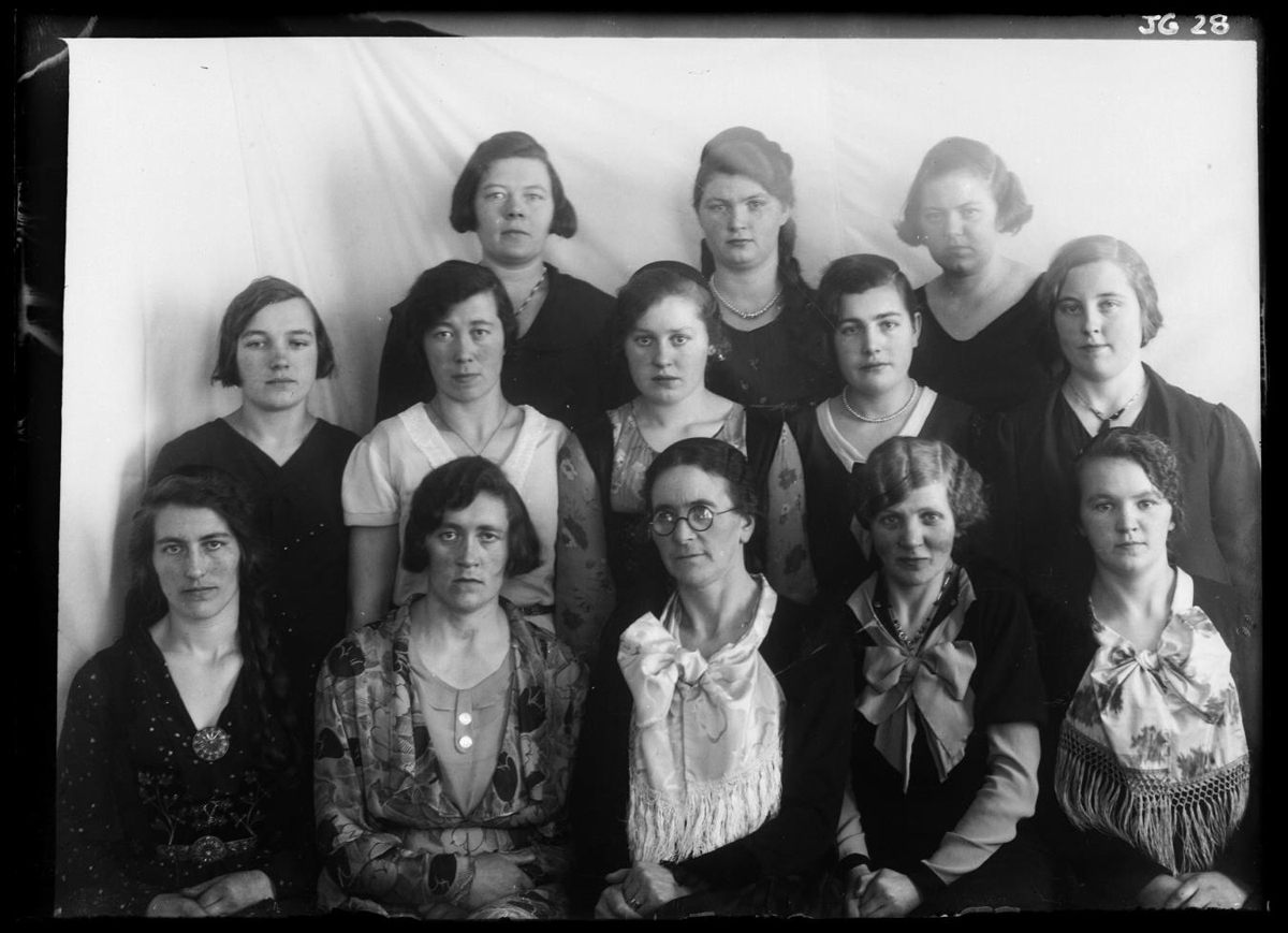 13 Nemendur Staðarfellsskóla 1933-1934: Sigurborg Kristjánsdóttir, skólastjóri, Staðarfelli, María Ólafsdóttir, Þurranesi, Saurbæ, miðröð f.v., Kristín Hjartardóttir Bjargarstöðum, Saurbæ, Eðvaldína Kristjánsdóttir frá Hólum, María Jónsdóttir, Kverngrjóti, Guðfinna Hannesdóttir, Hólum, Stokkseyrarhreppi, neðsta röð f.v., Jensína Jónatansdóttir, kennari, Staðarfelli.