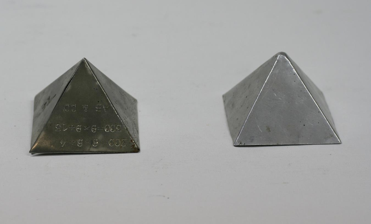 Málm píramíti, holur að innan sem var notaður til þess að telja pillur. Utan á hann eru hamraðir tölustafir (formula) sem útskýra notkun hans. Einnig er merkið AB & CO hamrað á eina hlið píramitans.