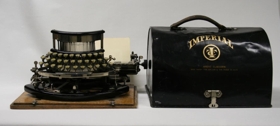 Einföld gömul ritvél skrúfuð föst á tréplötu með málmhettu af gerðinni IMPERIAL. Málmhettan er svört að lit með áletrunum IMPERIAL, ARENT CLAESSEN SOLE AGENT FOR ICELAND & THE FAROE ISLANDS