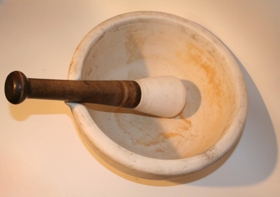 Óglerjað þykkt mortél með vör, ásamt pistli með 25 cm löngu tréskafti. Pistillinn sem er úr porstulíni er 9x12 cm.