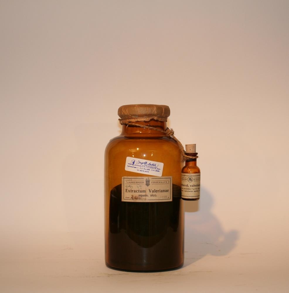 Áleturn á flöskunni er: Extractum Valeriana aquos. sicc. og framleiðandinn er A/S Alfred Benzon, Köbenhavn V. Áletrun á litla glasinu: Aeterol Valeroamae.