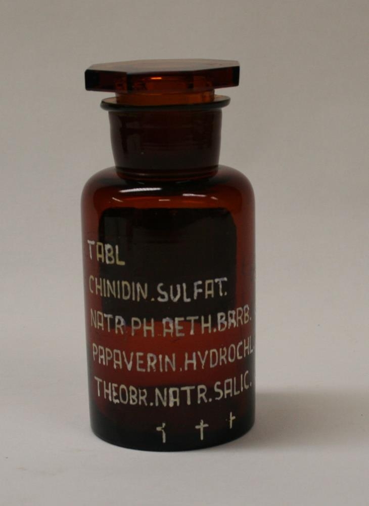 Brúnt standglas með áttstrendum slípuðum glertappa á áletrunum: TABL.CHINIDIN. SULFAT. 0,05 NATR.PH.AETH.BARB. 0.O2, PAPAVERIN HYDROCHL. 0,03, THEOBR. NATR. SALIC. 0,50 +++, og TABL. NATR. PH. AETH. BARB. 0,03, PAPAVERIN HYDROCHL. 0.03, THEOBR. CALC. SALIC. 0,50 +++.