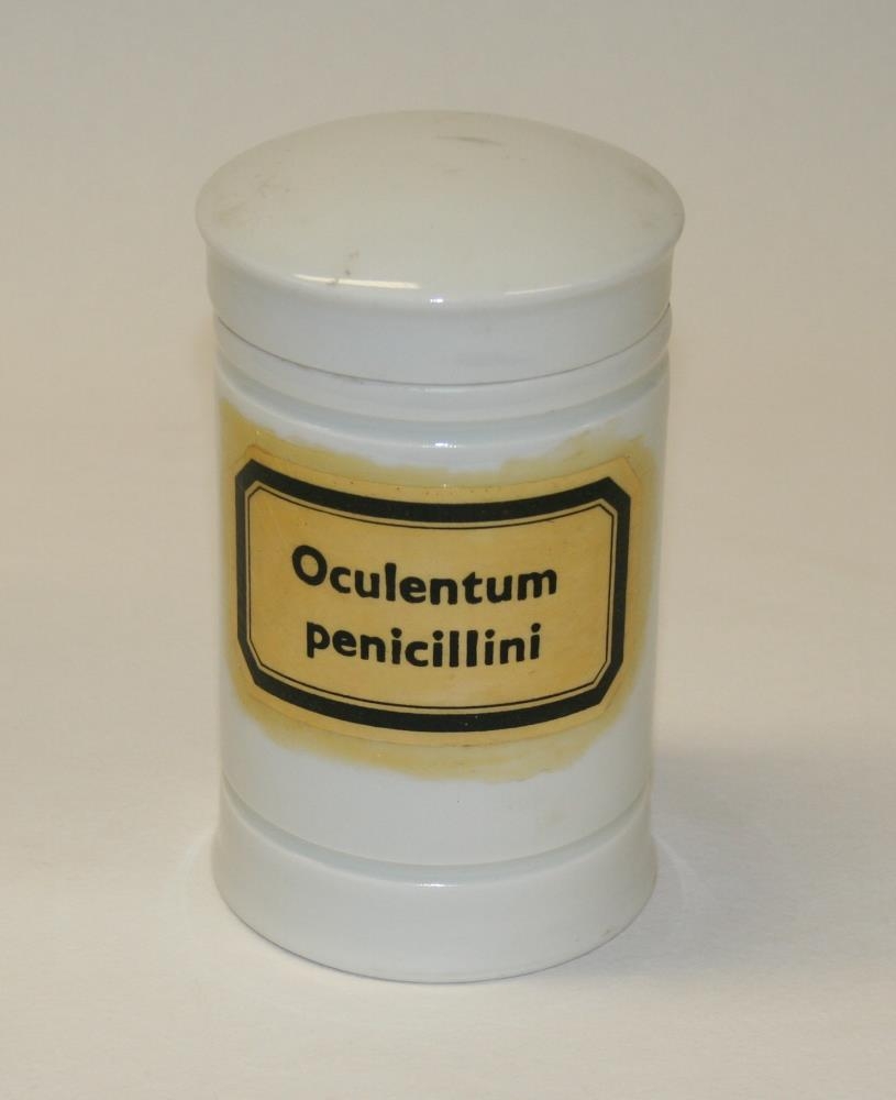 Hvít postulínskrukka með postulínsloki og innbrenndri áletruninni Oculentum Penicillini. Þetta er sérstakt því þarna er um augnsmyrsli að ræða og í áratugi hefur verð gerð krafa um að augnsmyrsli séu framleidd með smitgát (steril).