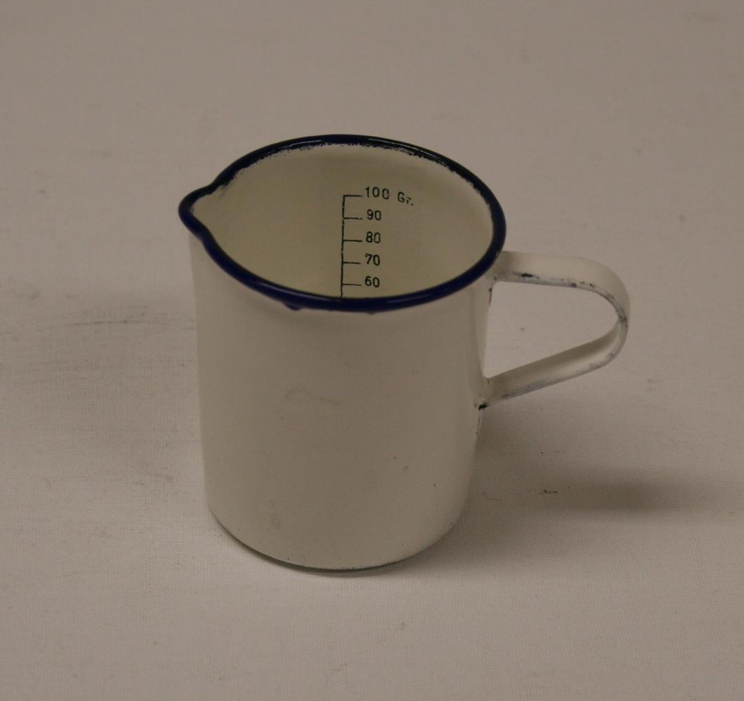 Emaleruð málm mælikanna hvít með blárri rönd efst. Inni í könnunni er kvarði sem sýnir frá 10 upp í 100 ml