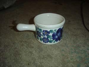 Hvít krukka með bláum og grænum skreytingum. Er með skafti og er 6 cm á hæð. Krukkan er frá dr. Selmu Jónsdóttur.