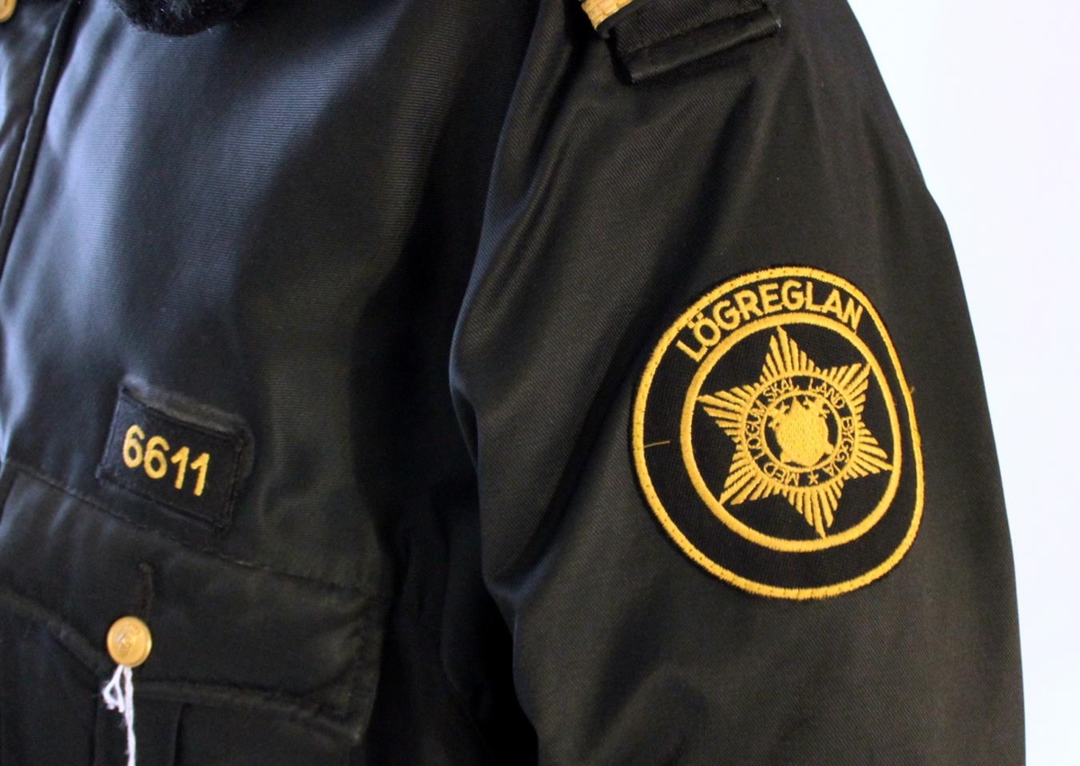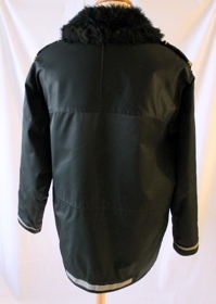 Loðfóðruð lögregluúlpa, 3 stjörnur á öxlum og merkt "lögreglan".