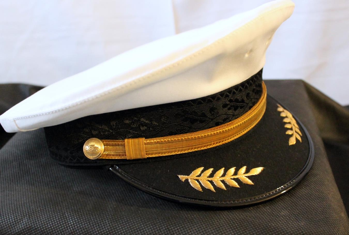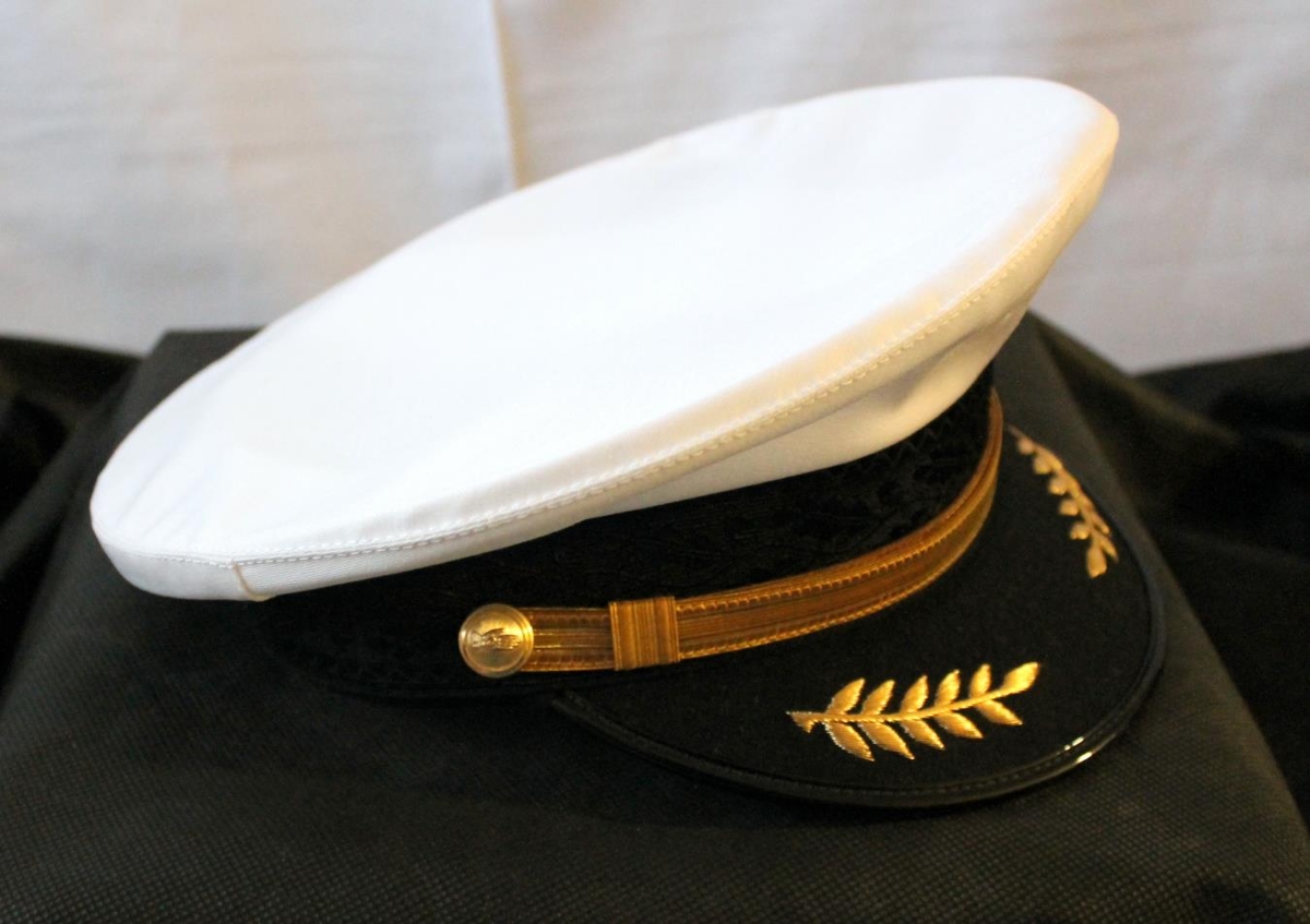Lögregluhúfa, hvít með svörtu deri. Merkið vantar á hana miðja.