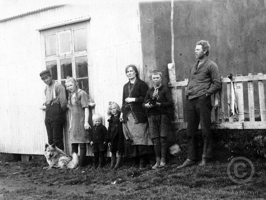 1.Halldór Sigvaldason (f. 1902), 2. Sesselja Sigvaldadóttir (f. 1913), 3. Ari Jóhannesson (f. 1926), 4. Margrét Vilhjálmsdóttir (f. 1923), 5. Sigurlaug Jósefsdóttir (f. 1874), 6. Sighvatur Kjartansson f. 1919, 7. Benjamín Sigvaldason (f. 1895). Myndin er tekinn 1929 eða 1930. Ljósmyndari: sennilega Guðmundur Trjámannsson.