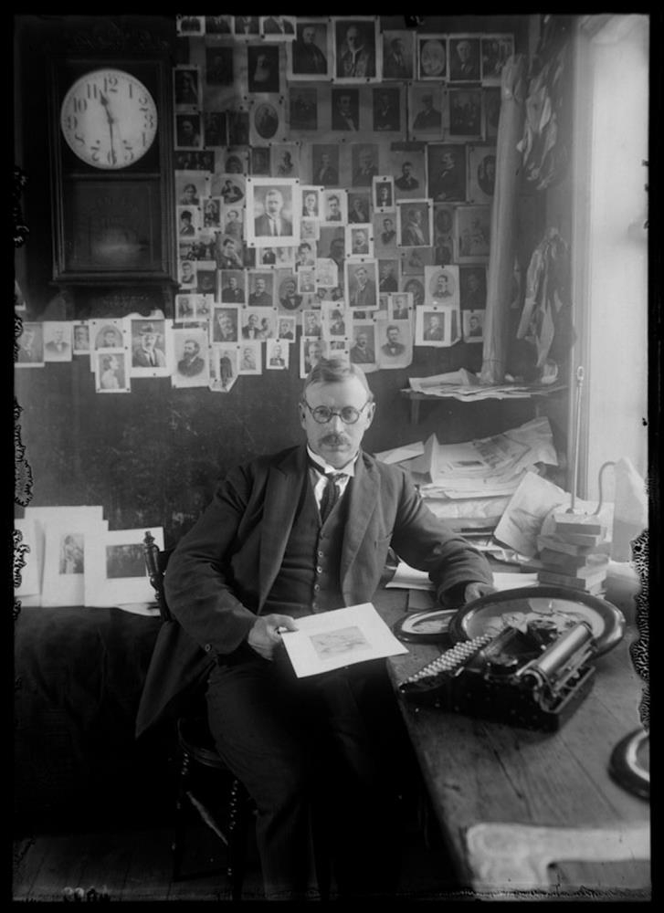 Karlmaður situr við vinnuborð með ritvél. Fjöldi prentmynda af fólki hangir á vegg á bak við hann við hlið veggklukka. Prentmyndastofa Ólafs Hvanndal.