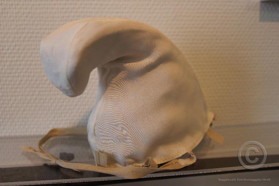 Faldurinn hefur upprunalega verið úr hvítu lérefti og er bæði vél- og handsaumaður. Hann er nú mjög skítugur og upplitaður. Trúlega er innan í honum pappaskífa og vír til að halda honu uppi og mynda krókinn að framan. Ekki er vitað hvaða efni er notað sem stopp, en trúlega tog. Trúlega er silki í hettunni utan um faldinn. Bendlaböndin á hettunni er nýleg að því er virðist. Ekki er vitað hver gerði faldinn.