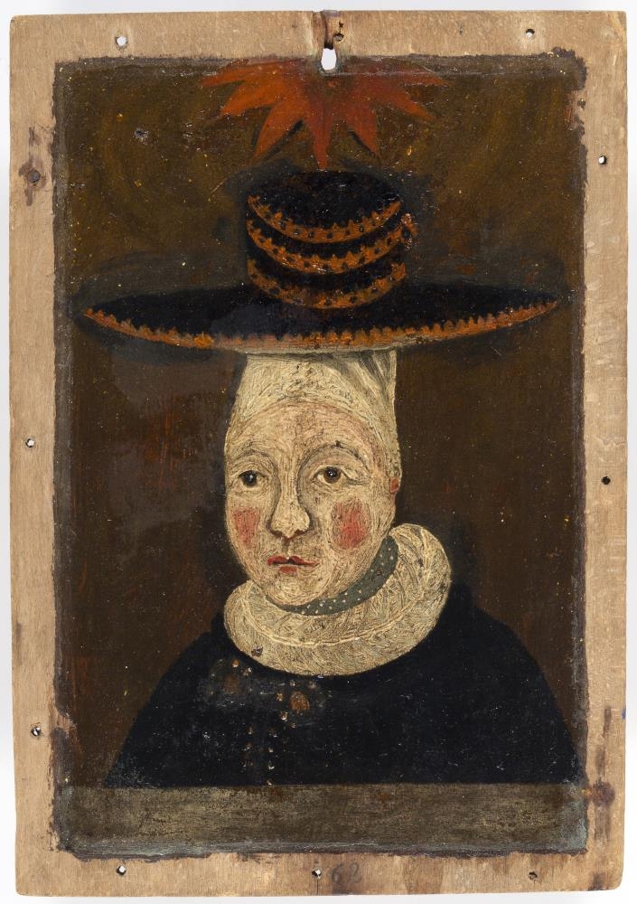 62. Mynd af einni Frú Gísla biskups Þorlákssonar, máluð á tré af einhverjum íslenzkum manni á seytjándu öld. Hún hefir þeirrar aldar íslenzkan búning: Hempu með hempuskjöldum og pörum, hvítan kraga um hálsinn og alhvítan fald á höfði niður í gegn, sem þá var títt, og hatt þar yfir, og sýnir það vel aldarmóðinn. Spjald þetta hékk fyrrum, að sögn Daða hins fróða Níelssonar, í bænhúsi í Gröf á Höfðaströnd, en þaðan var það flutt í Sjáfarborgarkirkju, ásamt annari mynd af annari frú herra Gísla, sem eg hefi séð, og mjög var lík hinni, hvað búninginn snertir.
