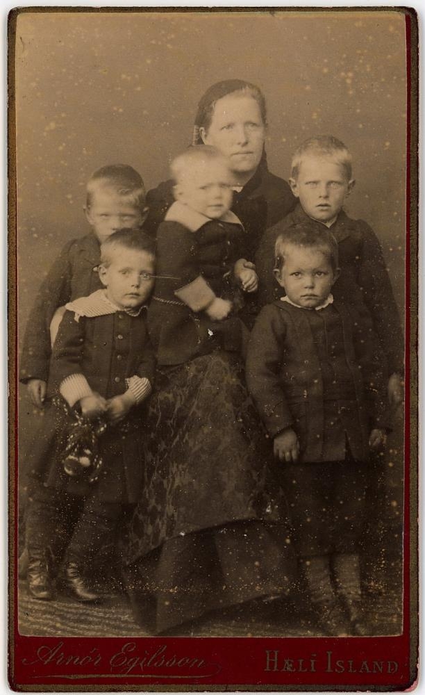 Guðrún Sigurðardóttir, prófastsfrú í Flatey, með syni sína og séra Sigurðar, efri röð: Jón, Brynjúlfur (á hnjám hennar) og Haraldur. Fremri röð: Jón Sigurður og Jens.