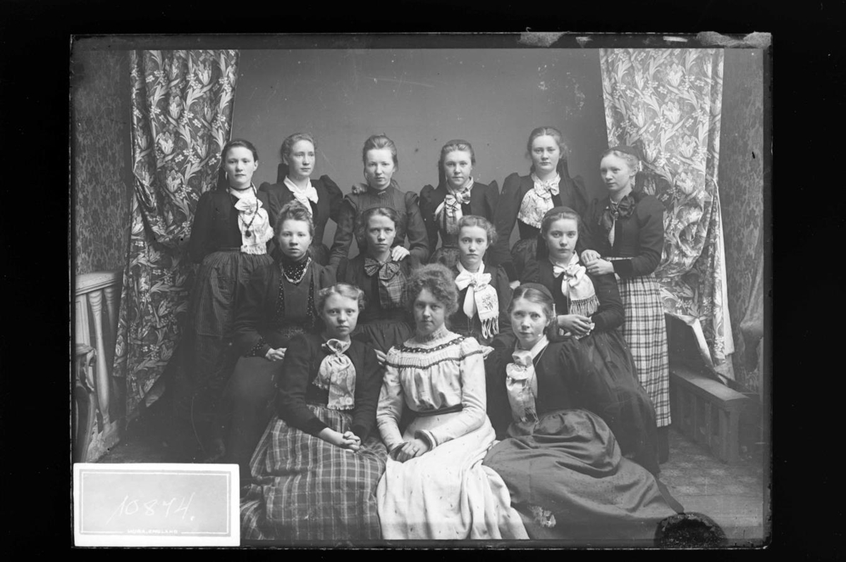 Hópmynd af 13 stúlkum. Hópmynd af 13 stúlkum, í fremstu röð eru: Sigrún Blöndal á Hallormsstað (?), Sigríður Zoëga, g. Jacobsen, og Sigurlaug Erlendsdóttir.