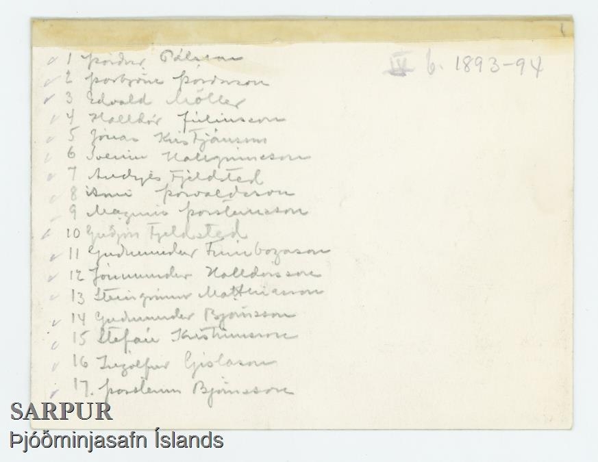 Hópmynd af 4.b.1893-4: Þórður Pálsson, Þorbjörn Þórðarsson, Edvald Möller, Halldór Júlíusson, Jónas Kristjánsson, Sveinn Hallgrímsson, Andrés Fjeldsted, Guðmundur Finnbogason, Jónmundur Halldórsson, Steingrímur Matthíasson, Guðmundur Björnsson, Stefán Kristinsson, Ingólfur Gíslason og Þorsteinn Björnsson.