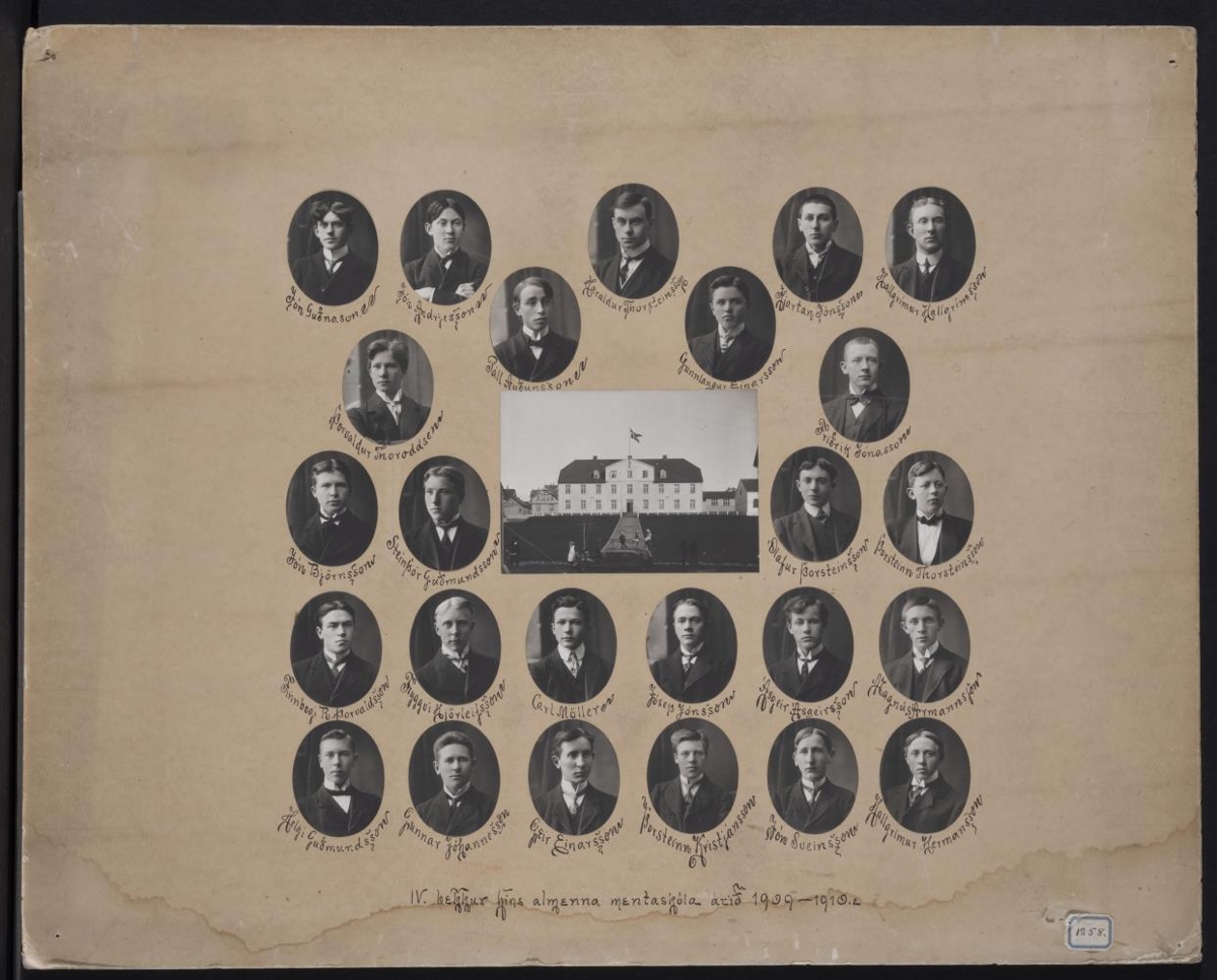 Menntaskóla árið 1909-1910, 25 menn og nöfn þeirra skrifuð undir. Á