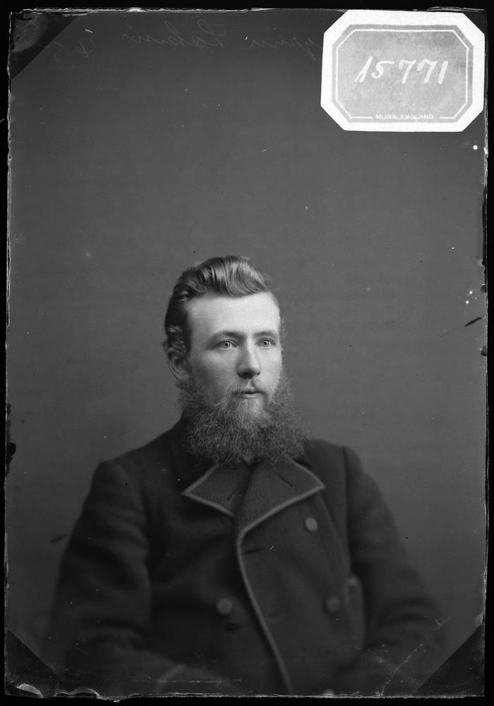 Karlmaður með alskegg í tvíhnepptum jakka með bryddingarborða á jöðrum.