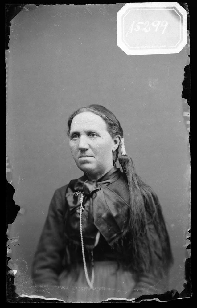 Kona á peysufötum. Keðja gengur frá slifsi og niður að mitt, líklega fyrir nisti.