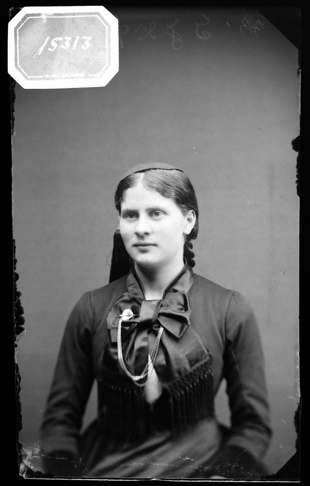 Kona á peysufötum, einhvers konar keðja gengur í sveig niður af slifsi.