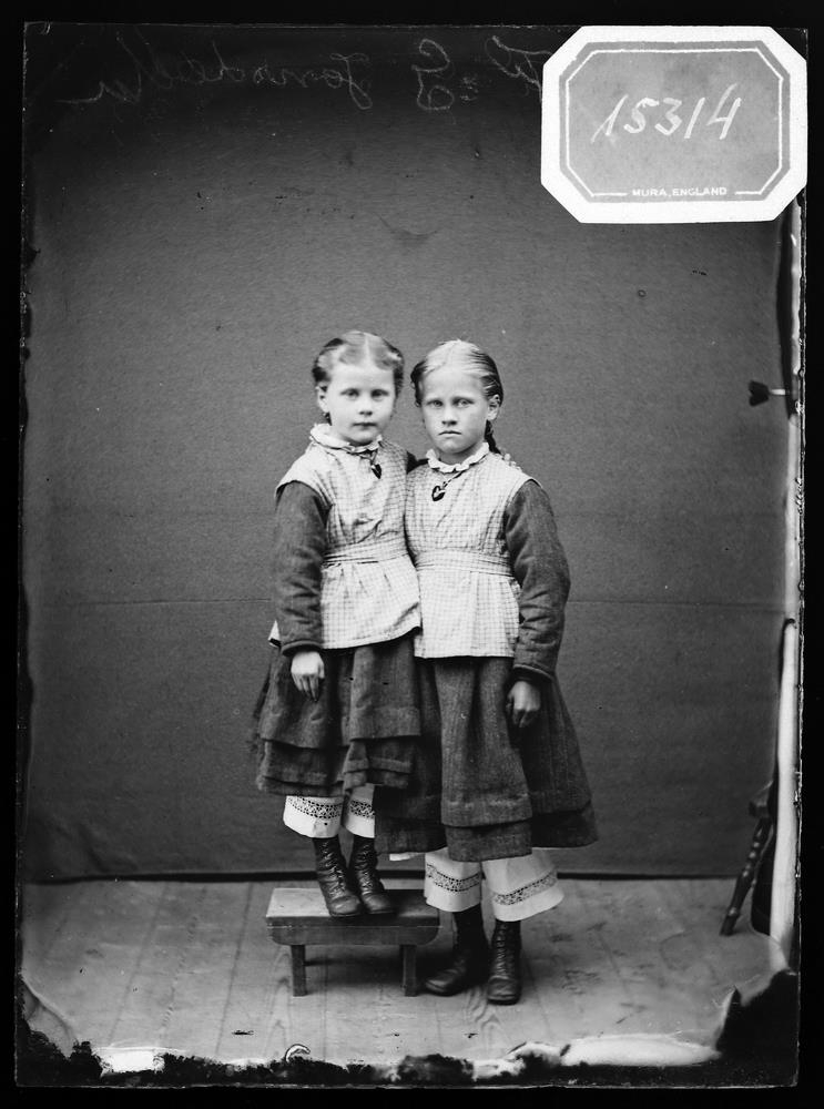 Tvær stelpur í kjólum og utanyfir þeim í eins konar svuntum sem teknar eru saman í mittið. Þær eru í buxum með útsaumuðum bekk undir kjólunum sem ganga niður fyrir kjólana.