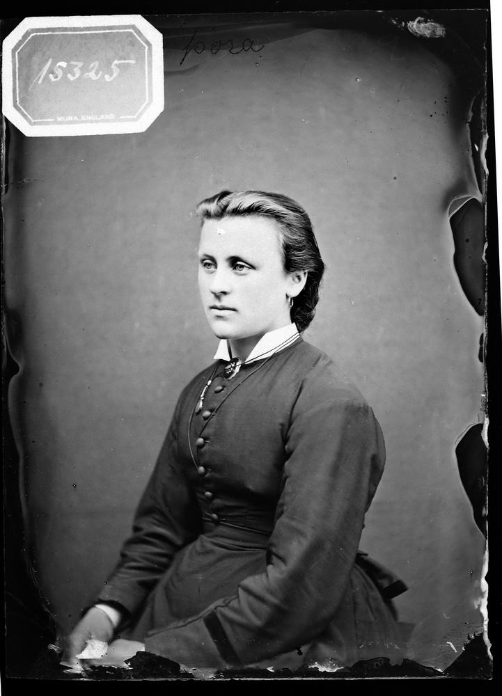 Kona í kjól hnepptum að framan með hvítum kraga og ermum. Hún er með nælu við hálsmál og nisti um hálsinn.