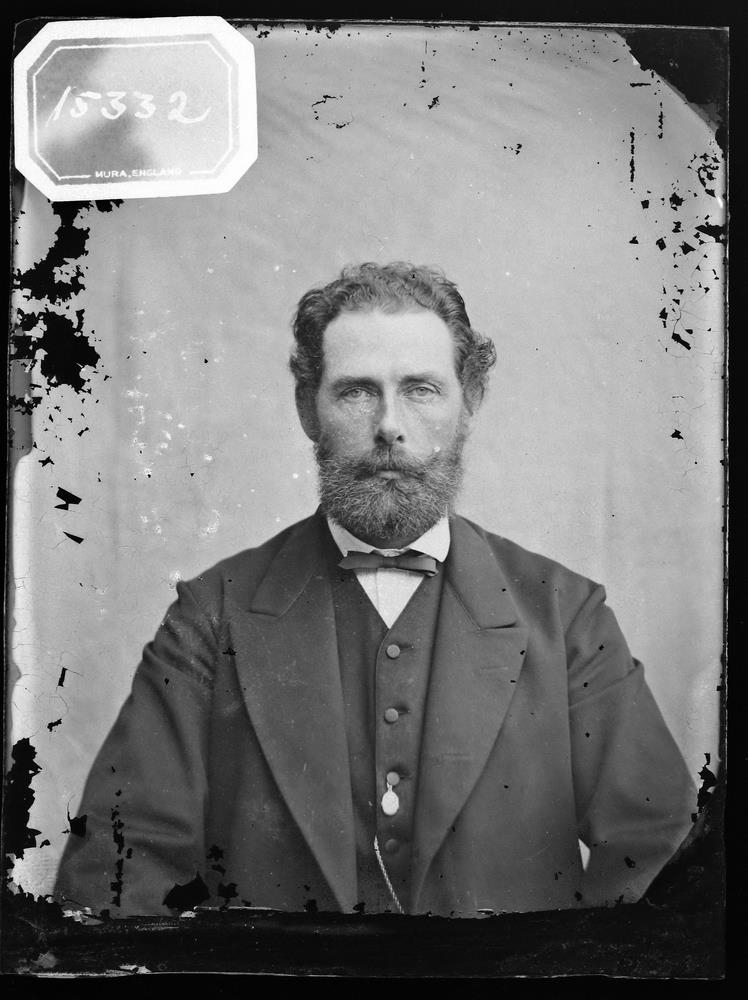 Karlmaður með alskegg og uppsnúið skegg á efri vör. Hann er í jakka og vesti, í hvítri skyrtu með slaufu og með úrfesti framan á vestinu.