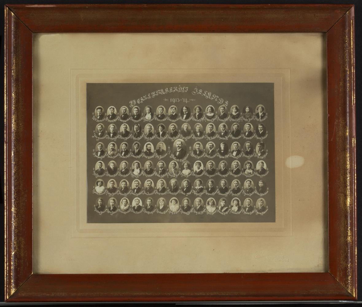 Verslunarskóli Íslands 1913-1914: Ari Thorlacius, versl., Brynjúlfur Magnússon (frá Prestbakka ?), Daníel Eggertsson, Daníel Sigurðsson, Dagmar Tómasdóttir, Erlendur Ó. Pétursson íþróttafrömuður, Einar Sigurðsson, Garðar Stefánsson, Guðrún Olga Ágústsdóttir (frá Stykkishólmi), Halldóra Jónsdóttir, frú Bárugötu Reykjavík, Haraldur Jóhannesson bankamaður, Hildur Zoëga, Hólmfríður Jónsdóttir, Inga Ágústsdóttir (frá Stykkishólmi), Jón Jónsson (síðar Fannberg), Kristján Jónsson gjaldkeri í Útvegsbankanum, Moritz Ólafsson Ámundason, Ólafur Guðmundsson (forstjóri Ísafirði), Ólafur J. Halldórsson, Lovísa Fjeldsted, Lárus Fjeldsted, Björn Pálsson Kalman, Árni Pálsson prófessor, Óli M. Ísaksson, Sigurður Árnason, Sigfús Guðmundsson, Sigurgísli Guðmundsson, Sigurður Jónsson. Sigurbjörn Jóhannsson, Sigurður Sveinsson, Sigurður Stefánsson, Tómas Stefánsson (aðalbókari Landssímans), Þorsteinn Erlingsson skáld, Helgi Jónsson grasafræðingur, Ólafur Eyjólfsson skólastjóri, Ágúst H. Bjarnason prófessor, Jón Sívertsen (síðar skólastjóri), Vilhjálmur Ögmundsson, Þórarinn B. Nielsen (síðar bankamaður), Þorkell Teitsson, Ari Kr. Eyjólfsson, Axel Jósefsson, Ástbjartur Einarsson, Ásgeir Guðmundsson, Eggrún Arnórsdóttir, Elís Ó. Guðmundsson, Guðmundur Loftsson (síðar útibússtjóri), Hólmfríður Árnadóttir kennslukona, Sigríður Árnadóttir kennslukona, Þyri H. Benediktsdóttir, Elías Hólm, Einar Magnússon, Emil Weyvadt, Elín Þorsteinsdóttir, Guðmundur Pétursson (síðar kaupmaður Ísafirði). Hjördís Benónýsdóttir, Hallgrímur Jónsson, Jóhann Árnason, Jónas Halldórsson (bróðir Páls skólastjóra Stýrimannaskólans), Jón Ívarsson, Jón E. Waage, Lúðvík Bjarnason (síðar kaupmaður Reykjavík), Lúðvig C. Magnússon, Margrét Jónsdóttir, Ragnar Gunnarsson, Sigmundur Jóhannsson, Sigurður Snorrason, Sigurður Þóðarson (söngstjóri), Þórður Albertsson (Þórðarsonar), Þórður Jensson, Björn Jónsson, Eiríka Eiríksdóttir, Felix Pétursson, Karl Schram, Kristinn Einarsson (síðar kaupmaður Reykjavík) Kristjana Ó. Einarsdóttir, Kristinn Kristjánsson, Olga D. Jónsdóttir (gift Gustav Sveinssyni lögfræðingi), Sveinbjörn Arinbjarnarson, Salóme Björnsdóttir, Sigurður Guðmundsson og Sigurður Jóhannsson. (Frumgerð, stærð 41 x 34½ cm).