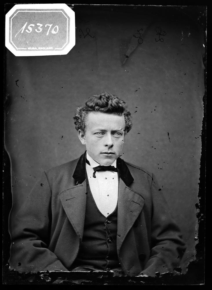 Karlmaður í fráhnepptum jakka, opnu vesti og hvítri skyrtu með slaufu.