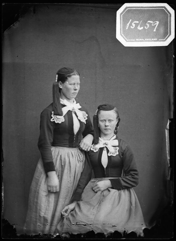 Tvær ungar konur á peysufötum. Þær eru með sams konar slifsi sem enda í eins konar tungu með útsaum. Báðar eru með nælu á slifis og önnur með nisti.