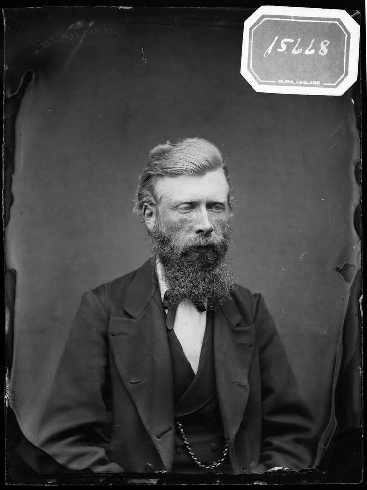 Skeggjaður maður í jakka og vesti og hvítri skyrtu með slaufu.