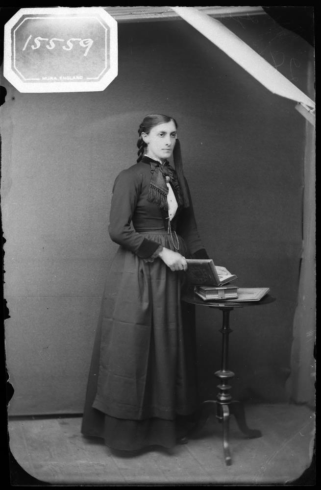 Kona á peysufötum stendur við borð með myndaalbúm í hendi.