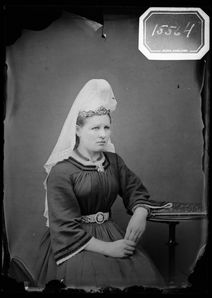 Kona í kyrtli með krókfald og spöng á honum. Hún er með svart hálsmen sem á hangir men og eins konar sprotabelti um mittið.