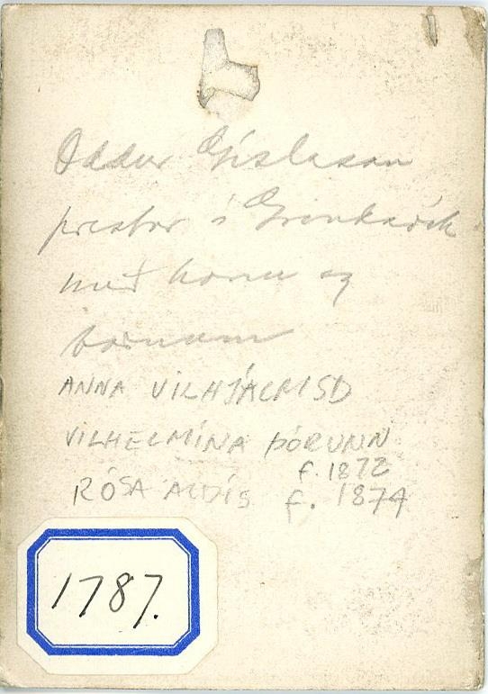 Oddur Gíslason, prestur í Grindavík, kona hans, Anna Vilhjálmsdóttir frá Kirkjuvogi og 2 börn þeirra, Vilhelmína Þórunn f. 1872 og Rósa Aldís f. 1874.