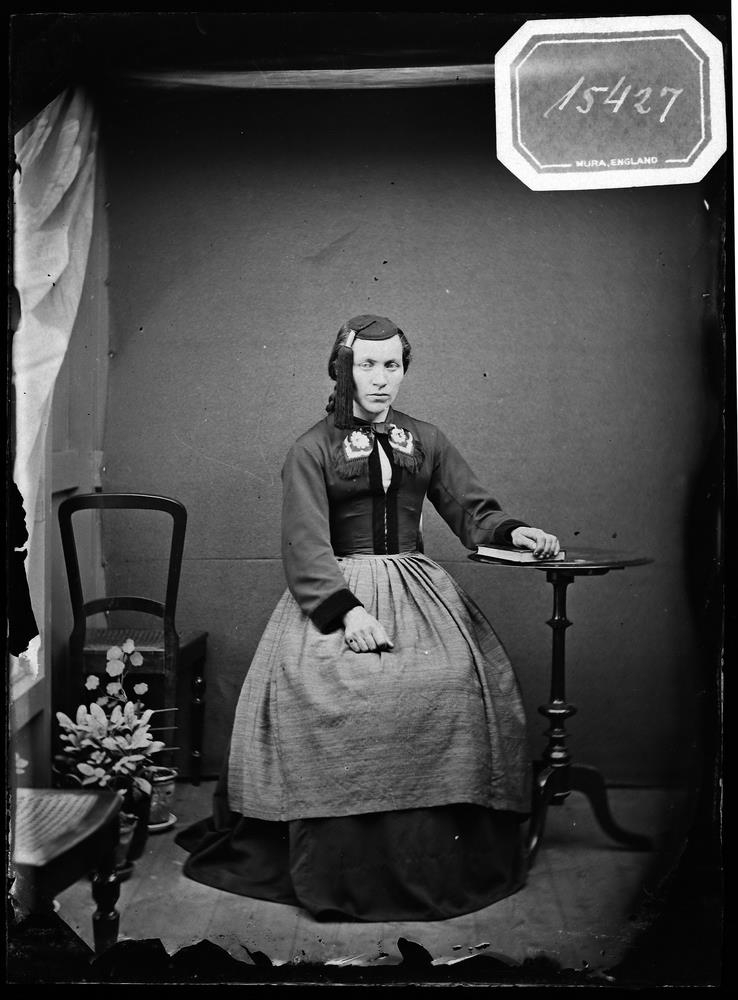 Kona á peysufötum situr við borð sem á hvílir bók og leggur hún hendina á hana. Tveir lausir stólar með tágasetu til hliðar og blóm í tveimur blómapottum.