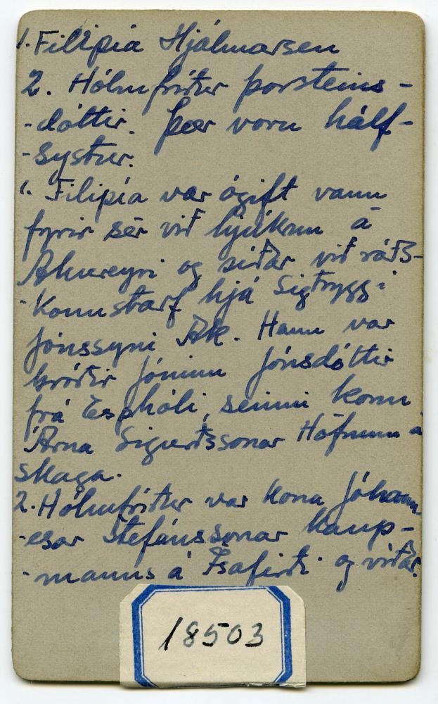 Filipia Hjálmarsen, og hálfsystir hennar Hólmfríður Þorsteinsdóttir, kona Jóhannesar Stefánssonar, kaupmanns.
