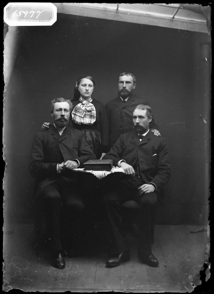 Þrír karlar allire með skegg og ein kona. Tveir karlanna sitja við dúkað borð með albúmi á, en þriðji maðurinn og konan standa. Sér í glervegg á þaki myndaskúrs.