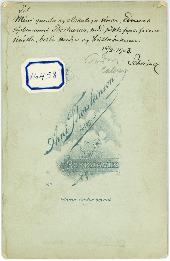 Guðmundur Scheving, læknir, Hólmavík. Á bakhlið er skrifað: Til Míns gamla og elskulega vinar Einars sýslumanns Thorlacius, með þökk fyrir forna vináttu, beztu kveðju og heillaóskum. 14/2-1903. Scheving