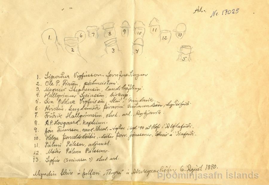 Ljósm. á spjaldi, í brúnum, útskornum mahogni ramma. Stærð 33 x 28,5 cm: 1. Sigurður Vigfússon, fornfræðingur; 2. Ole P. Finsen, póstmeistari; 3. Magnús Stephensen, landshöfðingi; 4. Hallgrímur Sveinsson, biskup; 5. séra Oddur Vigfússon [fyrir ofan Vigfússon stendur "V. Gíslason"], Stað í Grindavík; 6. Kristín tengdamóðir Þórarins Guðmundssonar, Seyðisfirði; 7. Friðrik Hallgrímsson, stud. art., Reykjavík; 8. A. P. Hovgaard, kapteinn; 9. Jón Finssson, cand. theol. (vígður í sept. '90 [1890] að Hofi í Álftafirði); 10. Helga Þorvaldsdóttir (dóttir Þorvaldar Jónssonar, læknis á Ísafirði); 11. Pálmi Pálsson, adjunkt; 12. móðir Pálma Pálssonar; 13. Sigfús (Sveinsson?), stud. art.