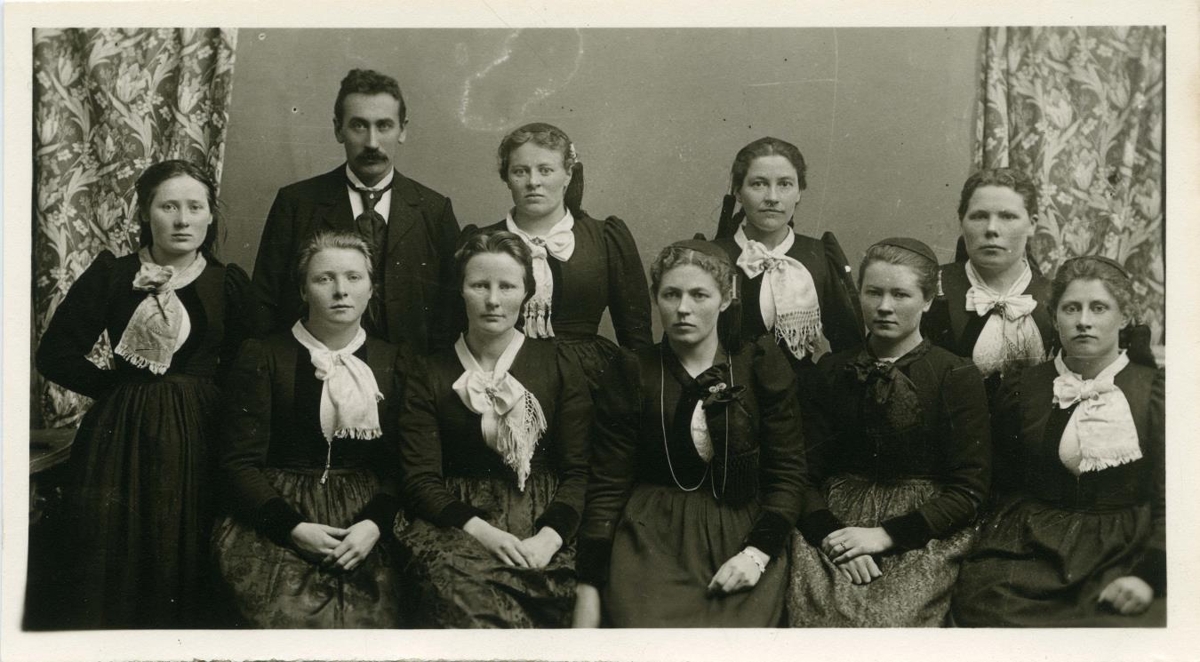 „Hans Grönfeldt með nemendum sínum veturinn 1902-1903. Þar sitja, talið frá vinstri, Sigríður Einarsdóttir frá Hofi í Vopnafirði, Sesselja Stefánsdóttir frá Guðmundarstöðum í Vopnafirði, Guðmunda María Guðmundsdóttir frá Kirkjubóli í Dýrafirði, Guðlaug Pálsdóttir frá Gilsá í Breiðdal og Svava Þórleifsdóttir frá Skinnastað í Öxarfirði. Þar standa Guðný Jónsdóttir af Austurlandi, Hans Grönfeldt Jepsen, Þóra Þórleifsdóttir frá Skinnastað í Öxarfirði, Kristjana Jónatansdóttir frá Fjalli í Aðaldal og Aðalbjörg Stefánsdóttir frá Möðrudal á Fjöllum.“ -Heimild/texti: Bókin Konur breyttu búháttum bls. 66