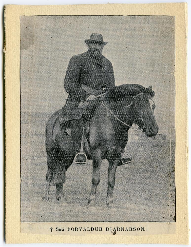 Prentuð mynd, límd á pappaspjald, stærð 13 x 9,9 cm: Séra Þorvaldur Bjarnarson, prestur að Melstað, á hesti, sem hann kallaði Halastjarna.