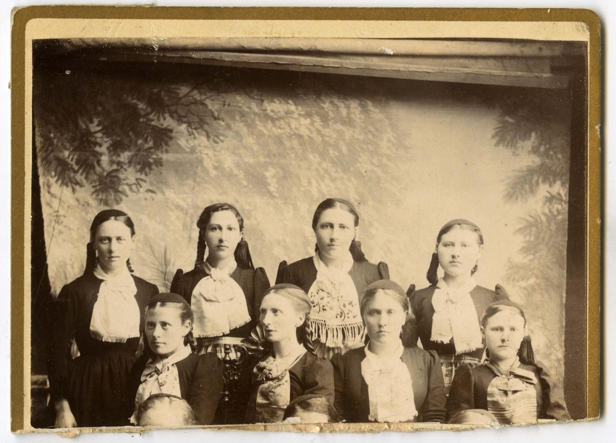 Jórunn Guðmundsdóttir með saumaskóla sinn. Þekktar í aftari röð: 2. Guðlaug Baldvinsdóttir, Böggvisstöðum, 3.Margrét Sigurðardóttir, Sámsstöðum í Hvítársíðu. Í fremri röð: 1. Salgerður Árnadóttir, Bakka og Bakkastíg, Reykjavík. 2. Jórunn Guðmundsdóttir, saumakona.