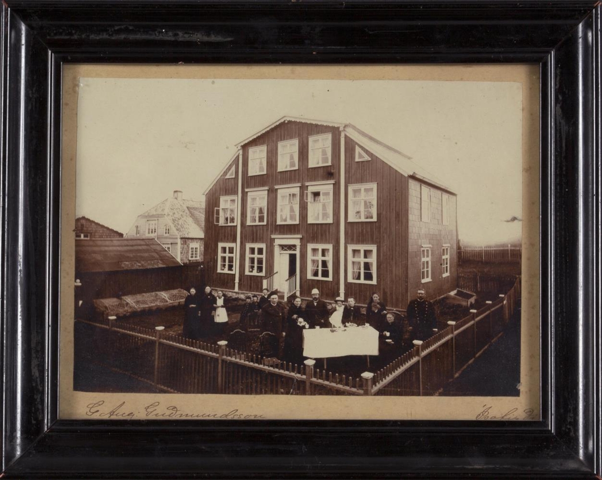Hópmynd tekin við hús Hjartar læknis Jónssonar, Stykkishólmi, árið 1891. Fólkið talið frá vinstri: